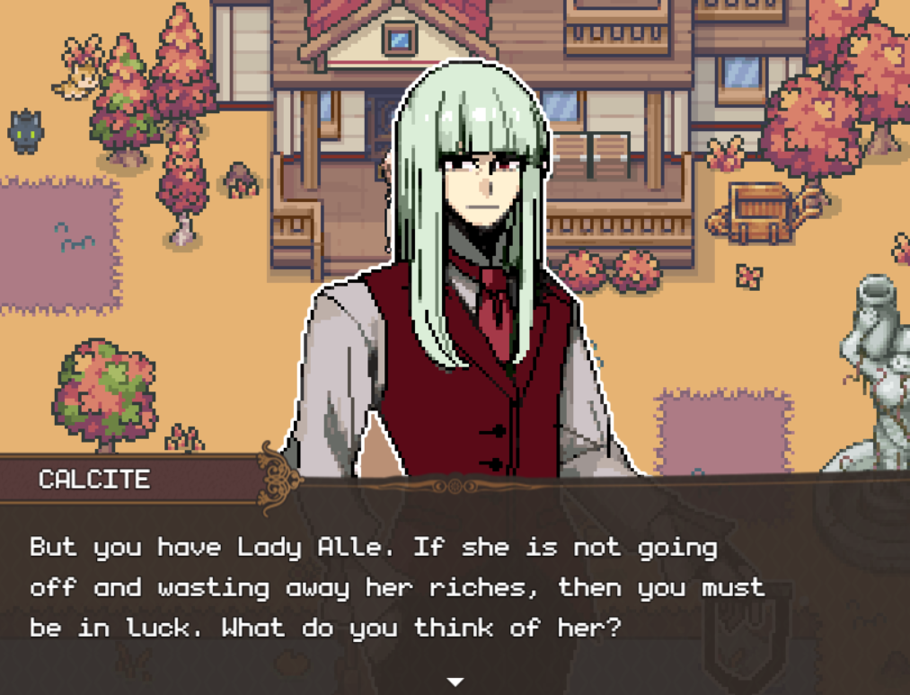 I LOVE THIS GAME SO MUCH!!! THE GRAPHICS RE SO CUTE AND THE DIALOGUE IS SO FUNNY , I PLAYED ON MY PHONE AND ITS FANTASTICCC the only thing i wished it had was a button to cook the meals instead of "Z" because i keep burning the food and miss alle gets mad at me :( but aside from that the game is really cute and beatiful im following your page and adding your game to my faves!!